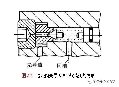 例,某液壓設備溢流閥,因不慎將先導閥座前端螺塞擰得過緊,將先導油路切斷(如圖2-2所示),結果使系統壓力升至9MPa,還超出正常調整壓力4MPa。
