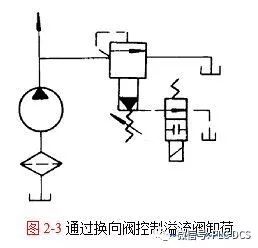 液壓系統中的卸荷控制方式一般通過換向閥控制溢流閥或采用M型中位機能的換向閥來實現,其液壓回路分別如圖2-3和圖2-4所示。
